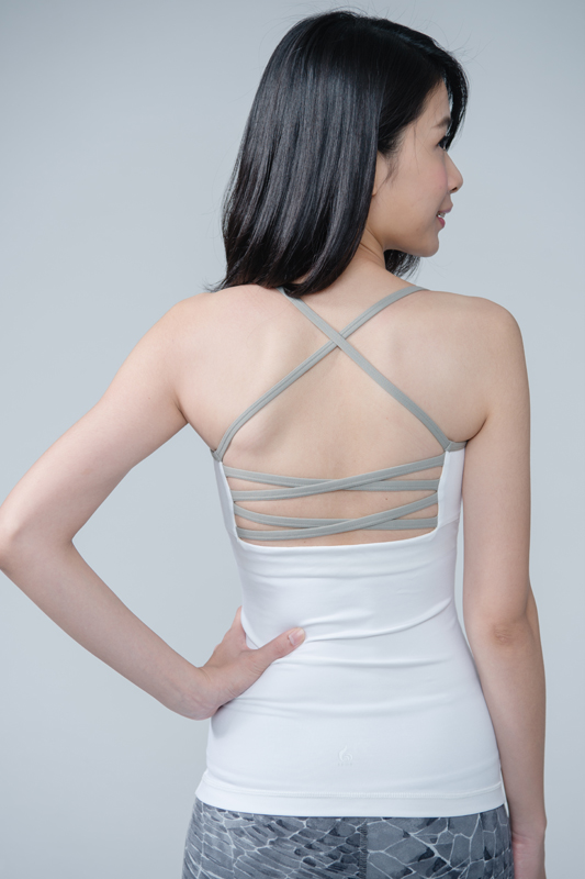 背後交叉細肩帶設計,親膚、高包覆性,穿起來更清爽舒適,(上衣附贈可拆式胸墊一副) / 模特兒三圍32/25/36,身高165CM 穿S號 / 圖片因打光及個人電腦色彩顯示不同會略有色差。